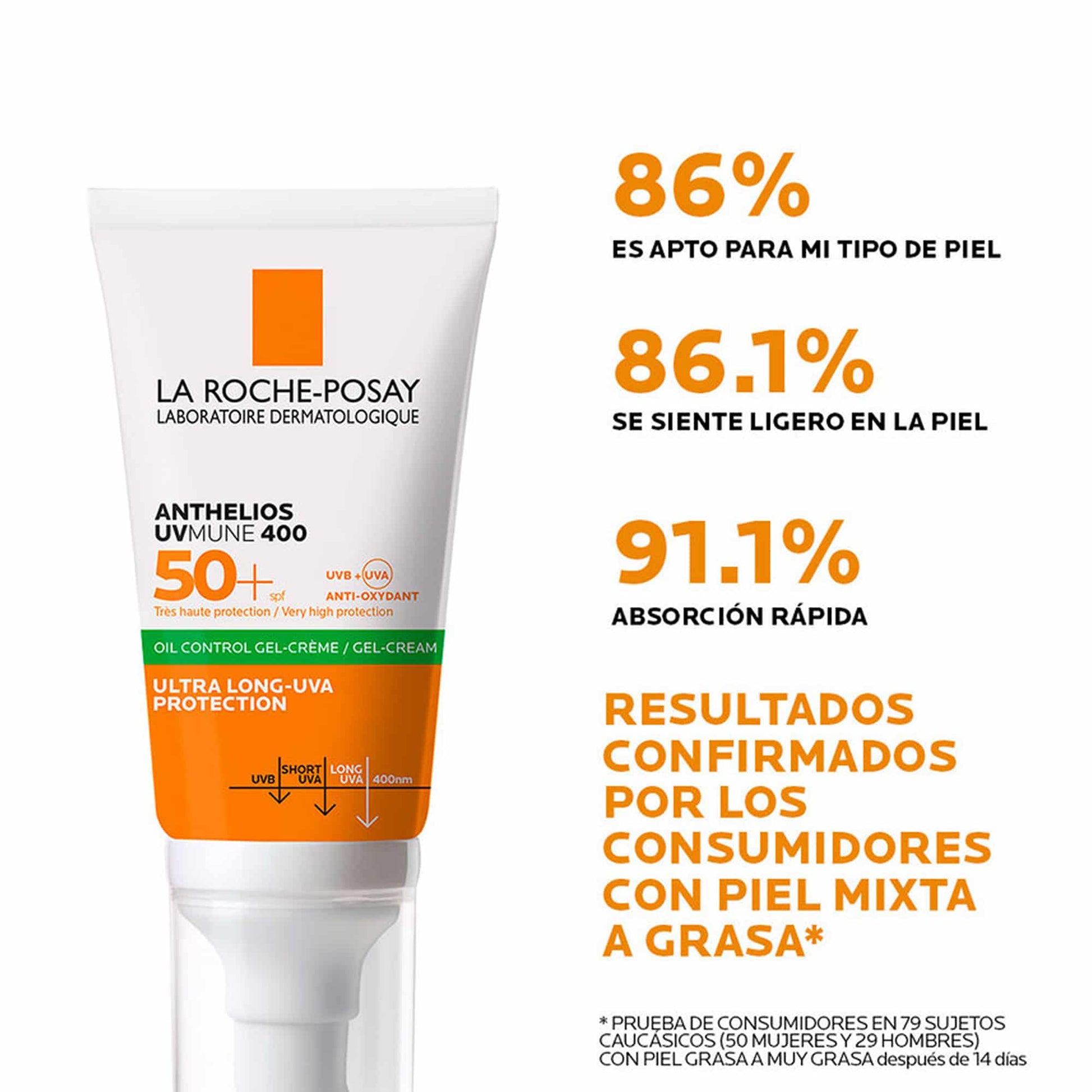 Respaldo clínico: estudios dermatológicos muestran protección solar eficaz con control de brillos, piel fresca y sin residuos.